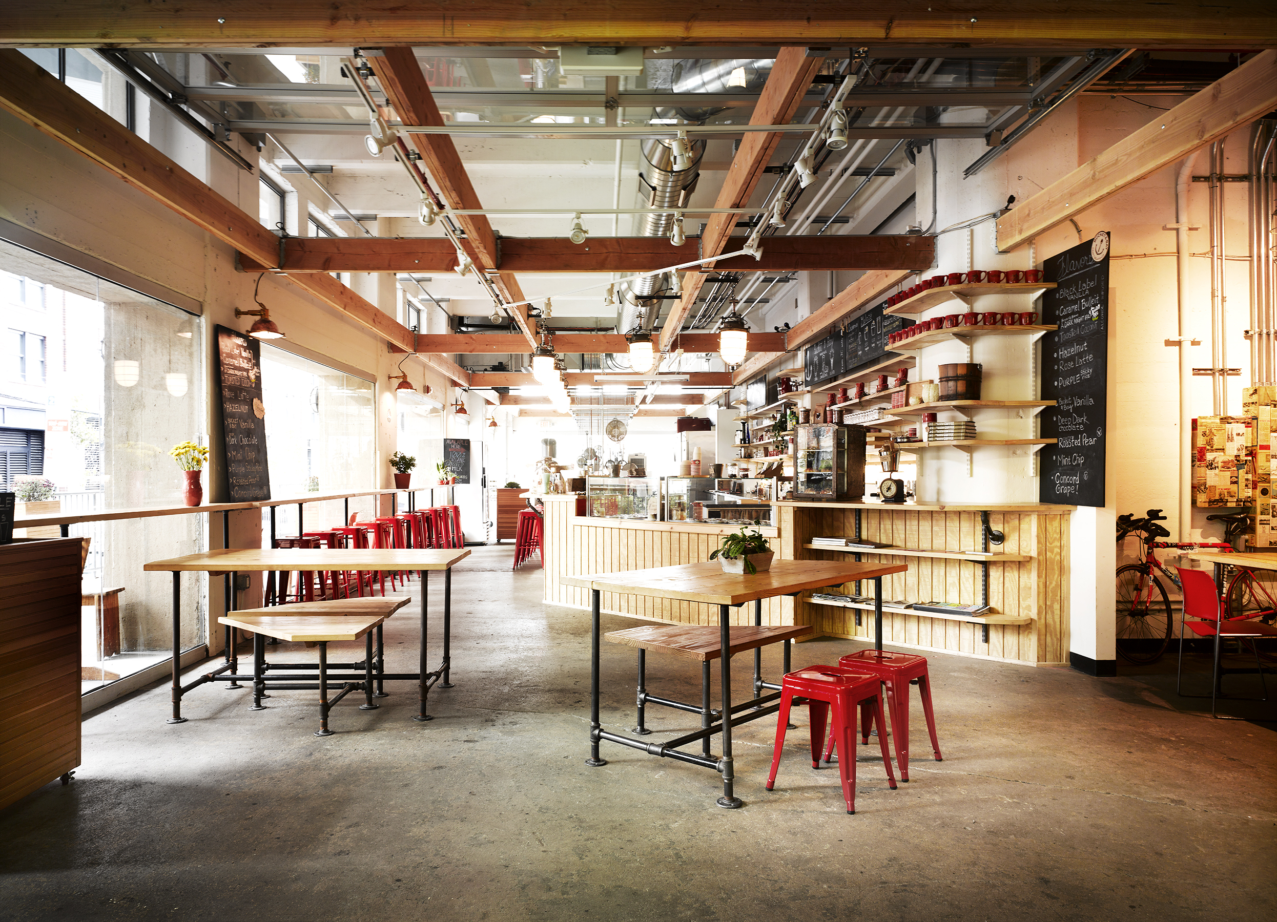Suspended wood ceiling frame that for equipment anchorage, signage, and lighting. Tables and benches serve multiple roles of seating, working and crafting.