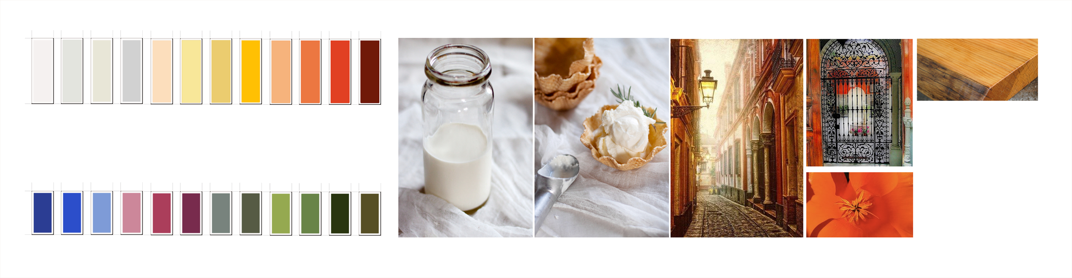 Colors and finishes are inspired by personal histories and material specificity: Spanish fruit, fresh milk, pastries, wrought iron, and handcrafted wood.