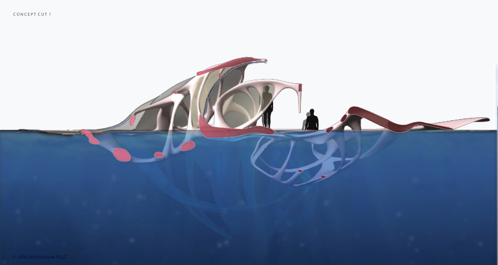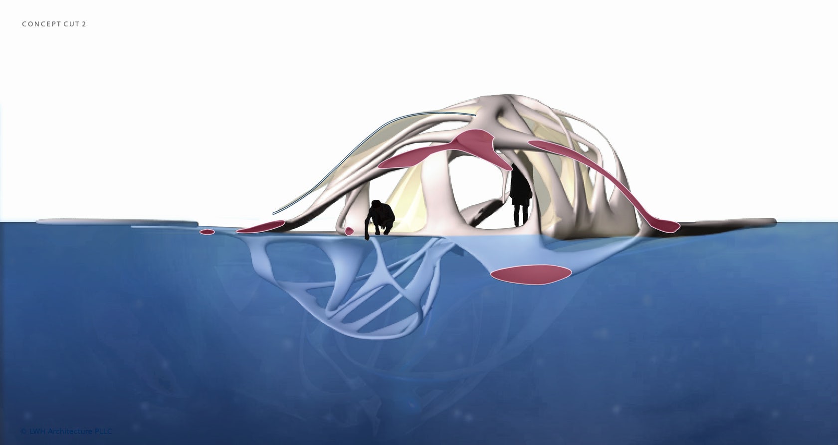 As water levels rise and recede, J-Space transforms: submerged, it becomes a sculpture to swim through and around; exposed, it reveals a studio — a site for solitary reflection or public gathering. Its lifecycle is legible: materials age, deform, and record time. The architecture does not erase its past.